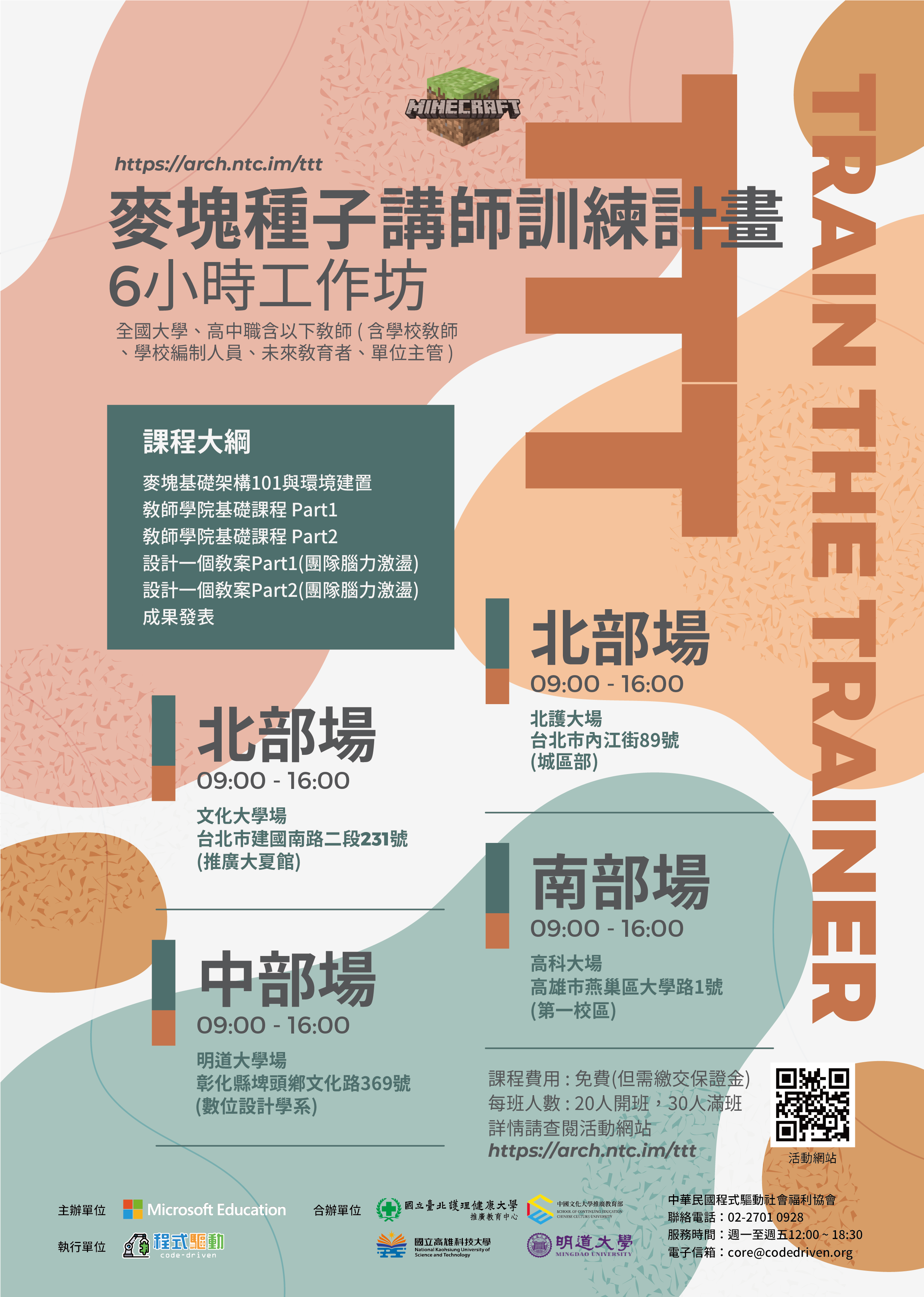 六、務必於課程網址: https://arch.ntc.im/ttt 與全國教師 在職進修資訊網兩處皆報名,並完成繳交保證金$300元才 算報名成功,全程參與者將核予【資訊非專】研習時數6小 時。