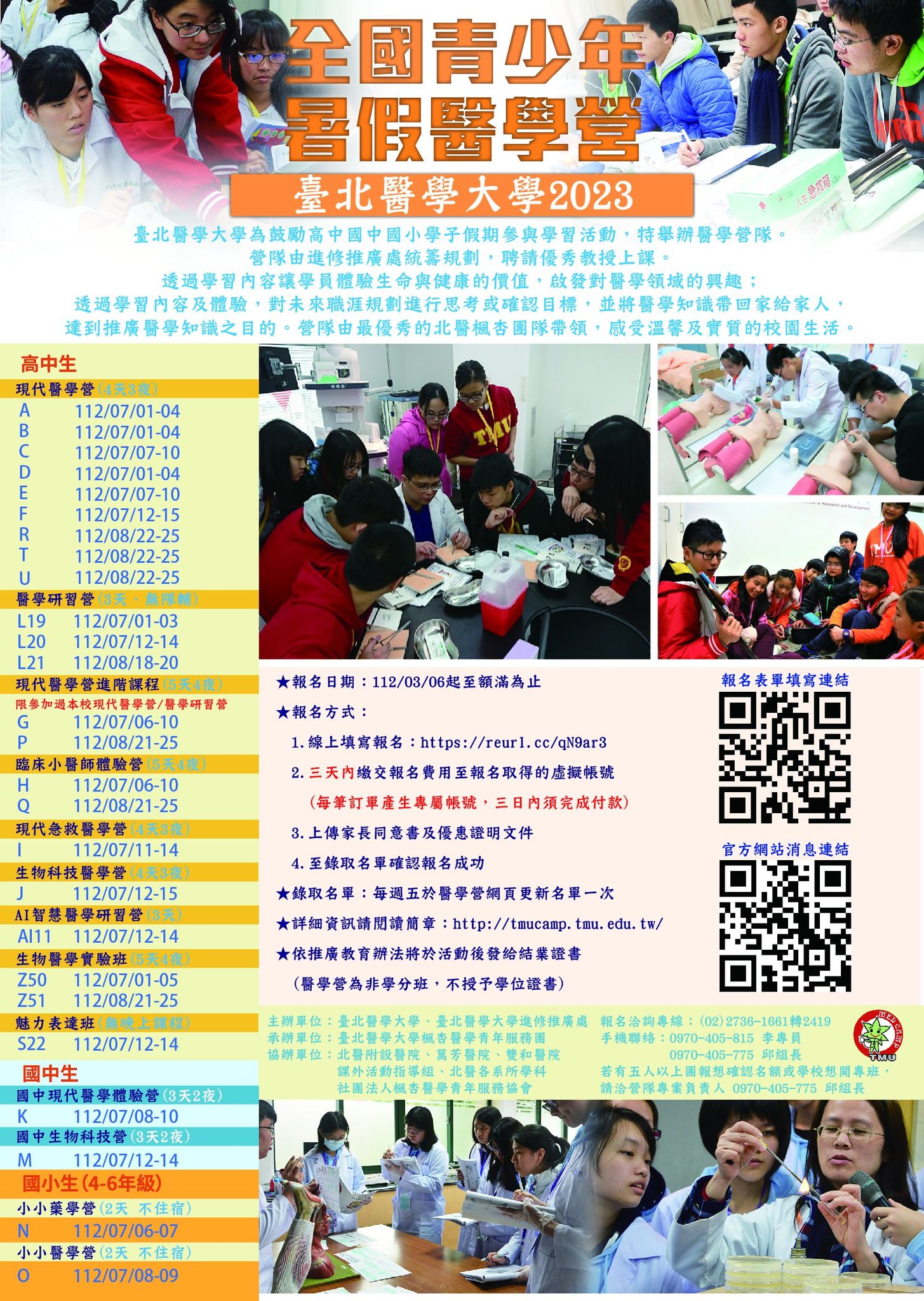 二、營隊資訊:2023暑期醫學營擬訂於民國112年7月1日至8月25日辦理。網址 http://tmucamp.tmu.edu.tw/