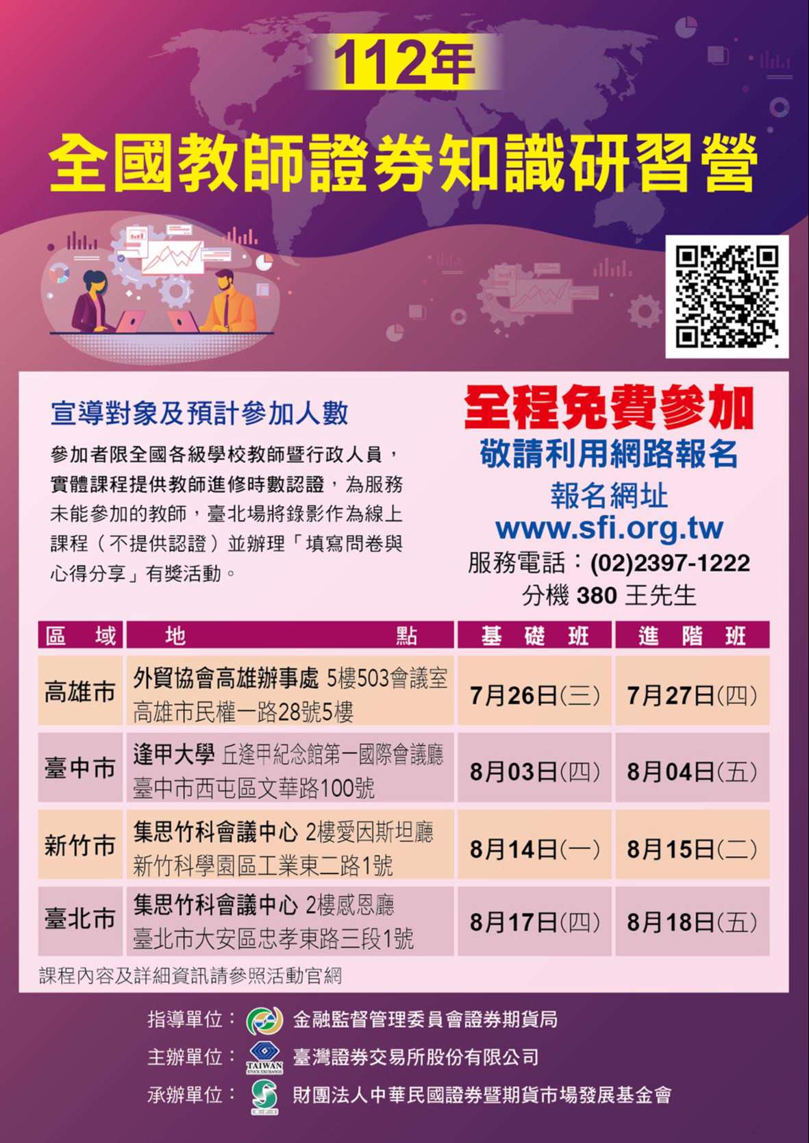 二、旨揭計畫活動為實體課程完全免費,教師參與本活動可獲 得「教師研習時數」認證,敬請協助自即日起至8月18日 止,於網站上建立連結以廣為周知,並鼓勵教師報名參 加,電子文宣如附件,連結網址為 https://webline.sfi. org.tw/workshop/Default.asp?csn=631