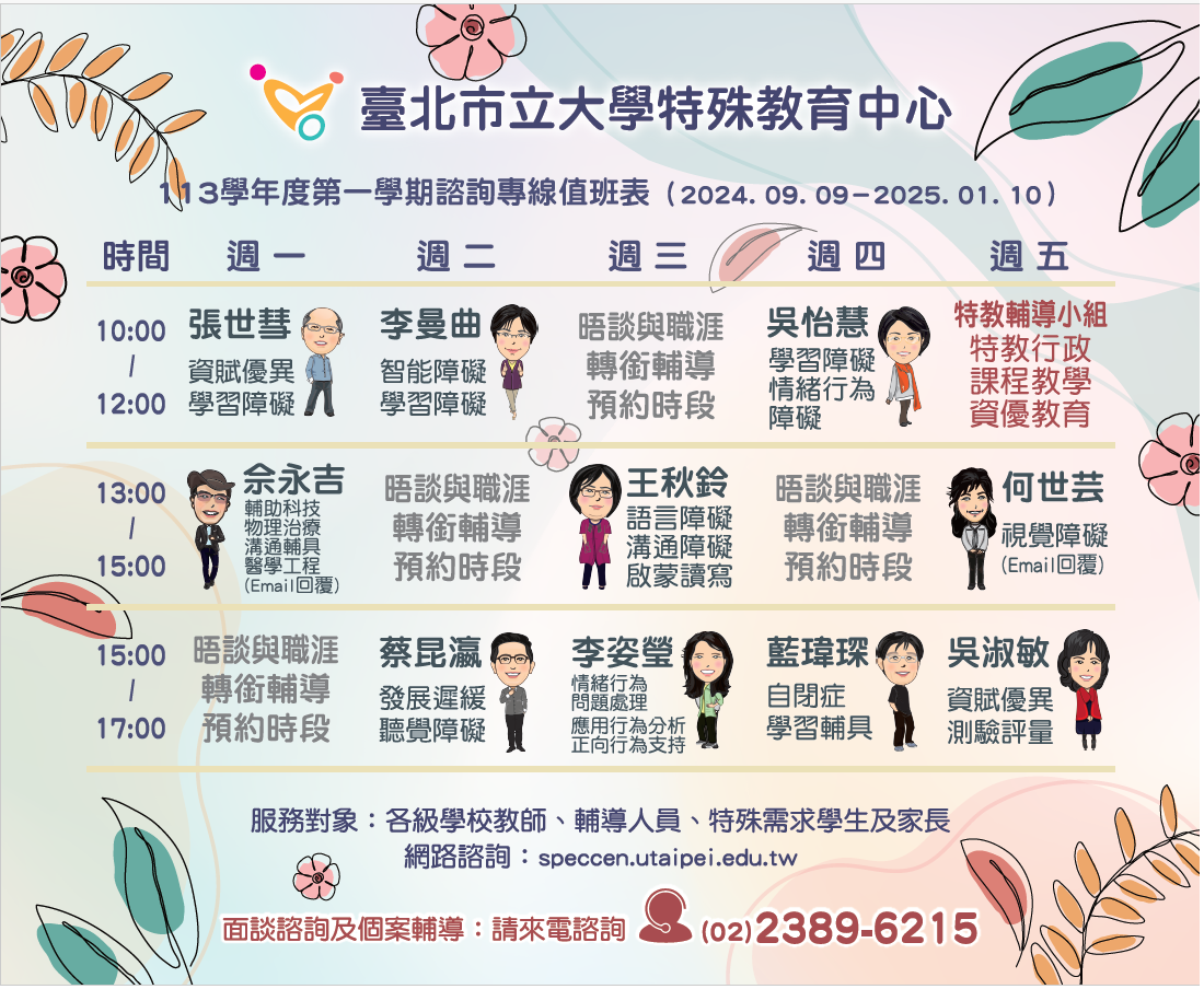 主旨:臺北市立大學特殊教育中心113學年度第1學期特殊教育諮詢專線一案,請鼓勵學校教師、輔導人員、教保員、行政