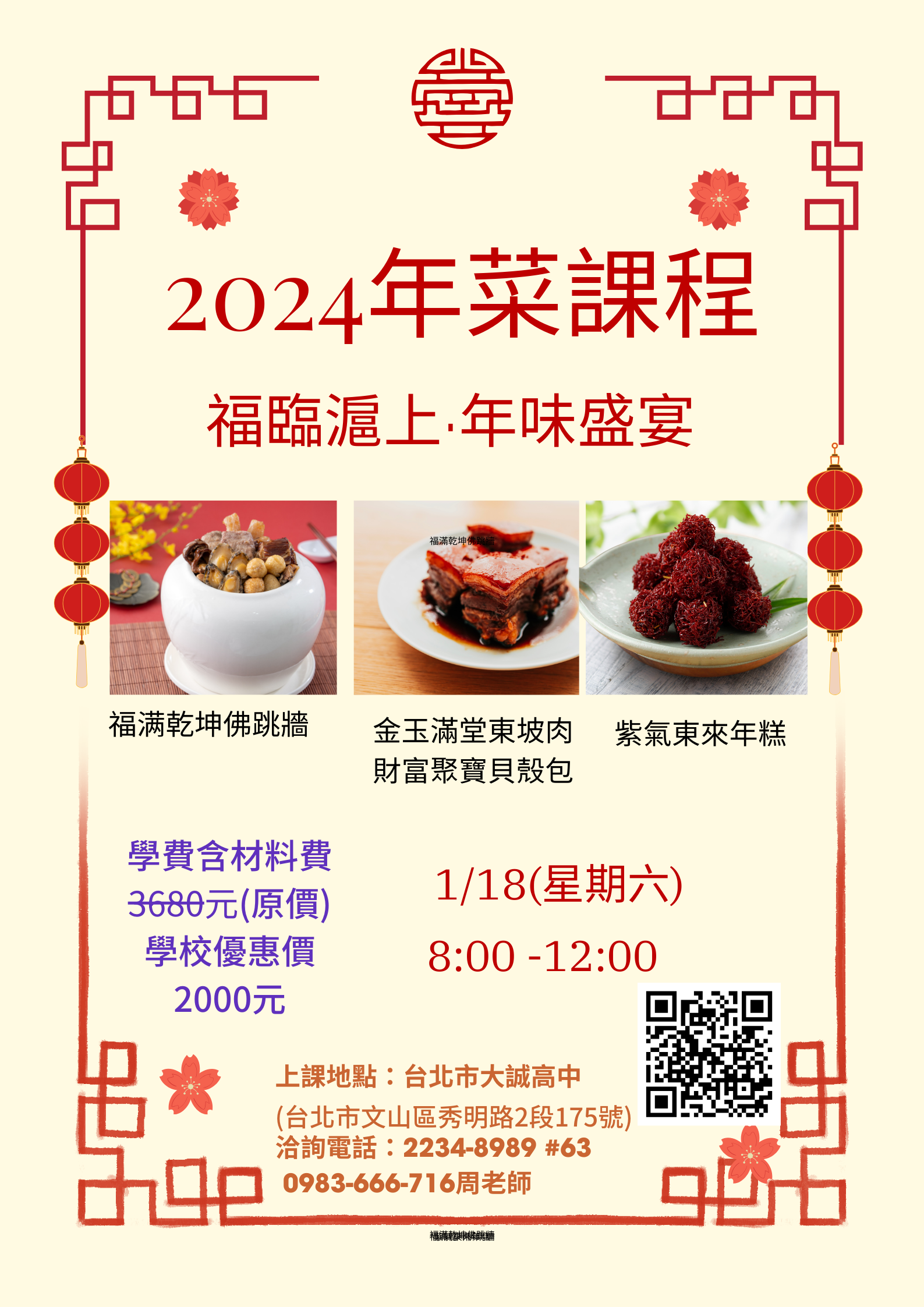 臺北市私立大誠高級中學辦理【中餐烹調2024年菜】體驗課程,歡迎對中餐烹