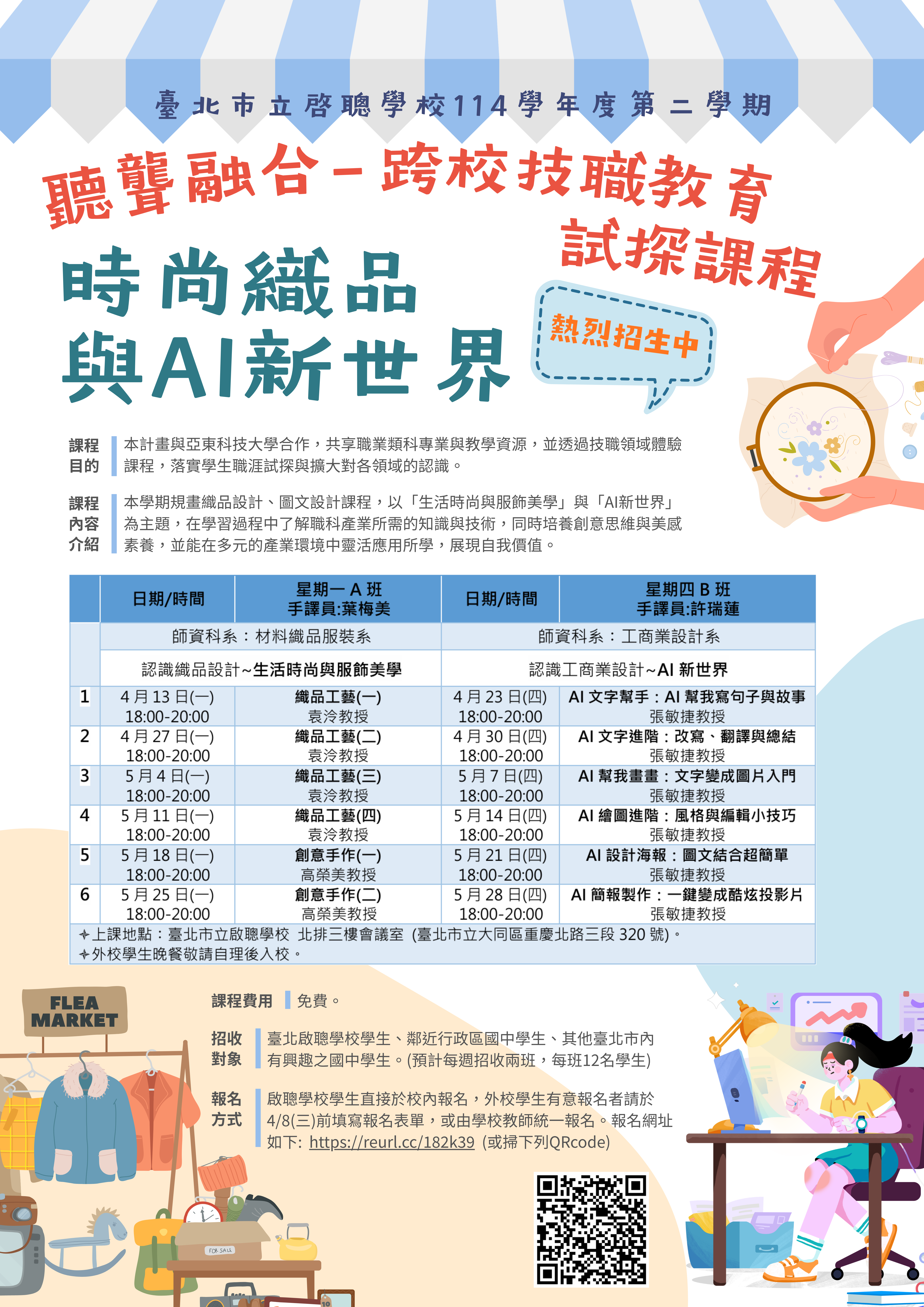 一、課程目的:本校114學年度與亞東科技大學師資合作,為落實學生職涯試探與群科認識,以「時尚織品與AI新世界」為主題設計課程,進行跨校技職教育試探與實作。