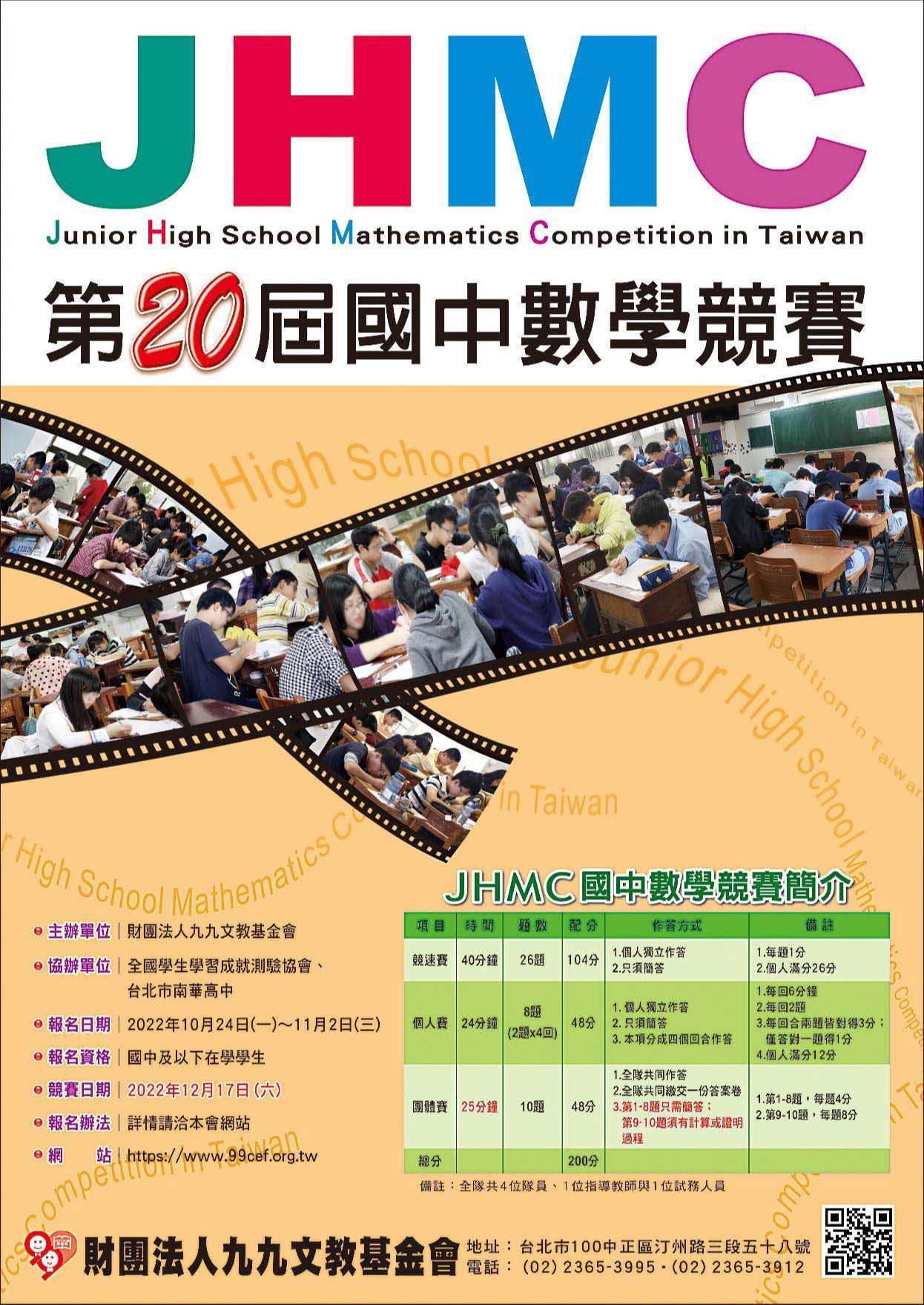 五、活動地點:將於台北、新竹、台中、台南、高雄與花蓮六 區舉行。 (一)因場地限制,各地區參賽隊伍數額滿後,JHMC線上報名 系統即不再受理報名,但本會保留調整各地區隊伍數上限的 權利,敬請有意參賽之同學,儘快完成報名手續。 (二)因本活動為競賽活動,為鼓勵參賽隊伍良性競爭互動, 本會訂有地區參賽隊伍之下限(20隊),若報名隊伍數未達此一下限時,為增加競賽的趣味性,擬將原報名該區之隊伍併 入鄰區參賽。
