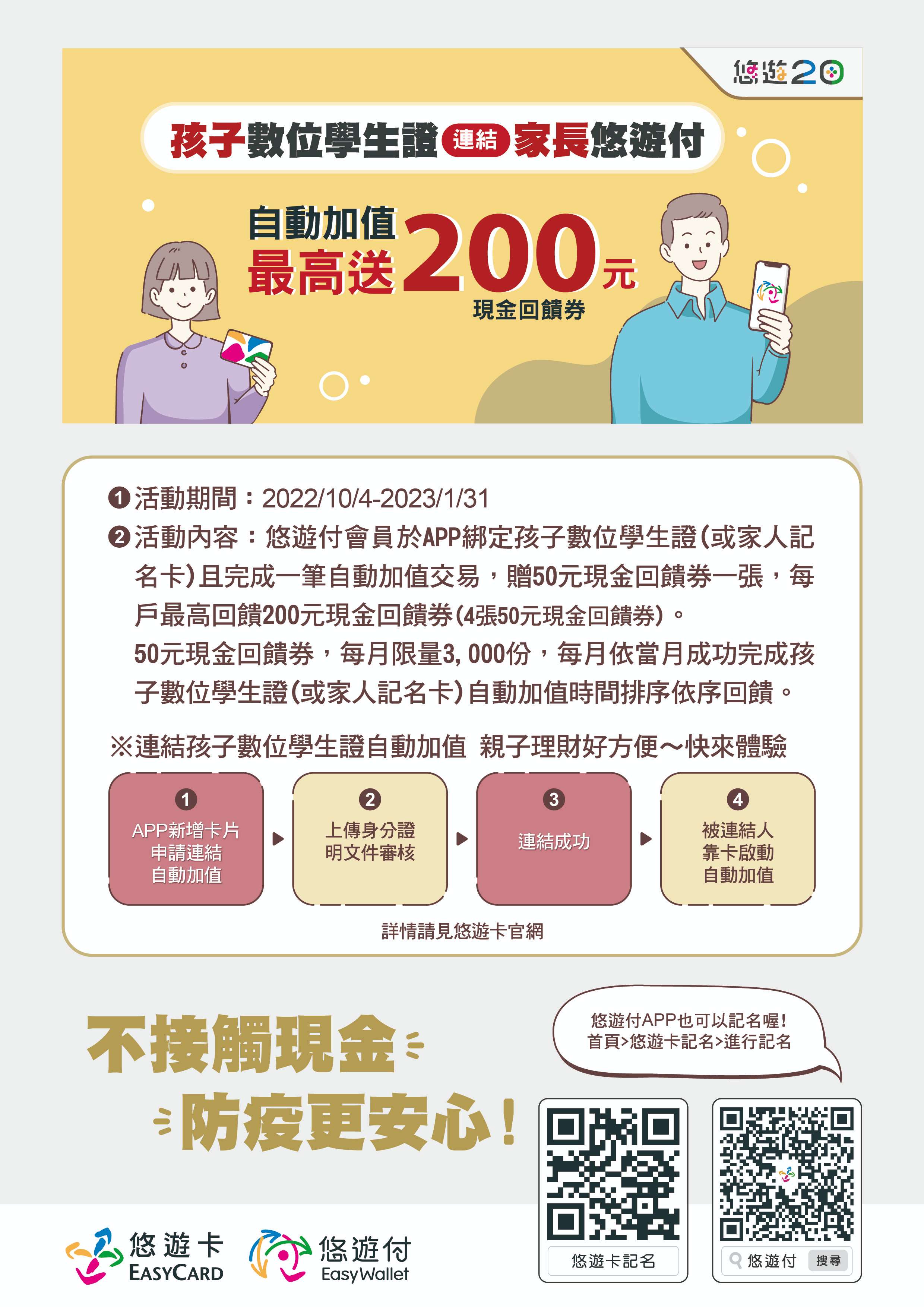 家長透過3步驟即可完成自動加值設定(悠遊付綁定數位學生證悠遊卡),為鼓勵家長使用此服務,悠遊卡公司亦提供相關獎勵活動(活動連結:https://easywallet.easycard.com.tw/
