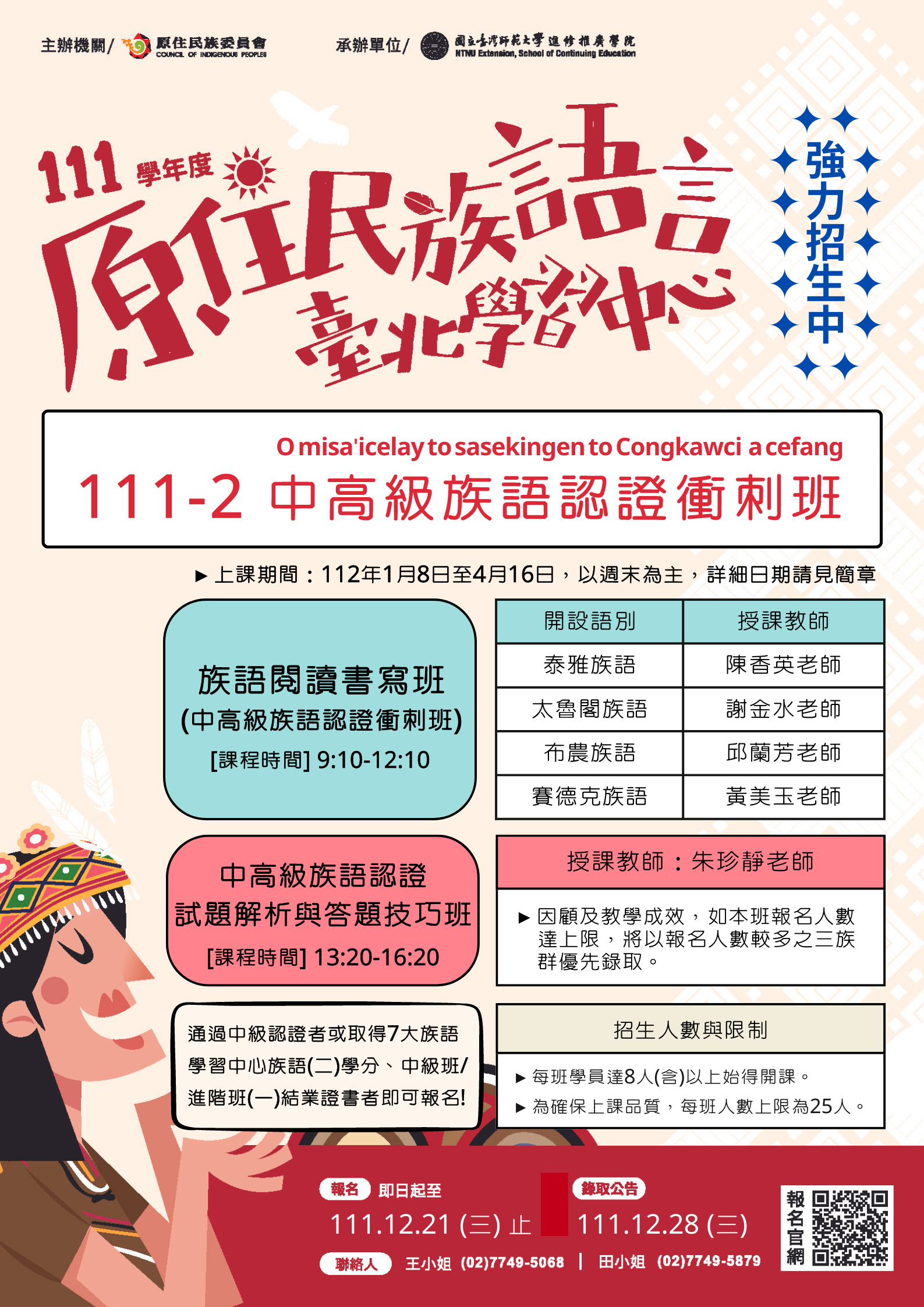 旨揭專班招生對象針對有意願學習原住民族文化及語言, 並欲參加中高級族語認證考試者。