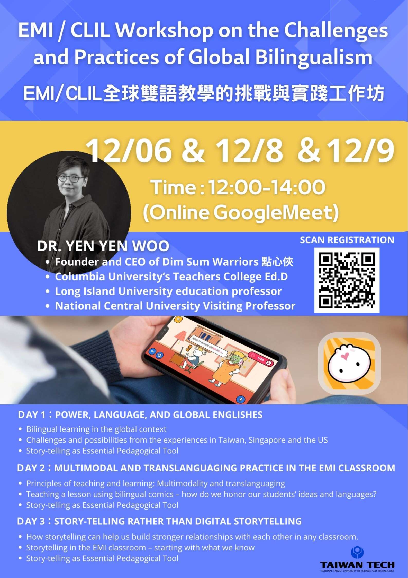 二、旨揭工作坊分別辦理12/6、12/8及12/9場次,可核發全國 教師在職進修網研習時數,請先至以下表單進行報名: https://reurl.cc/kqaDM9。