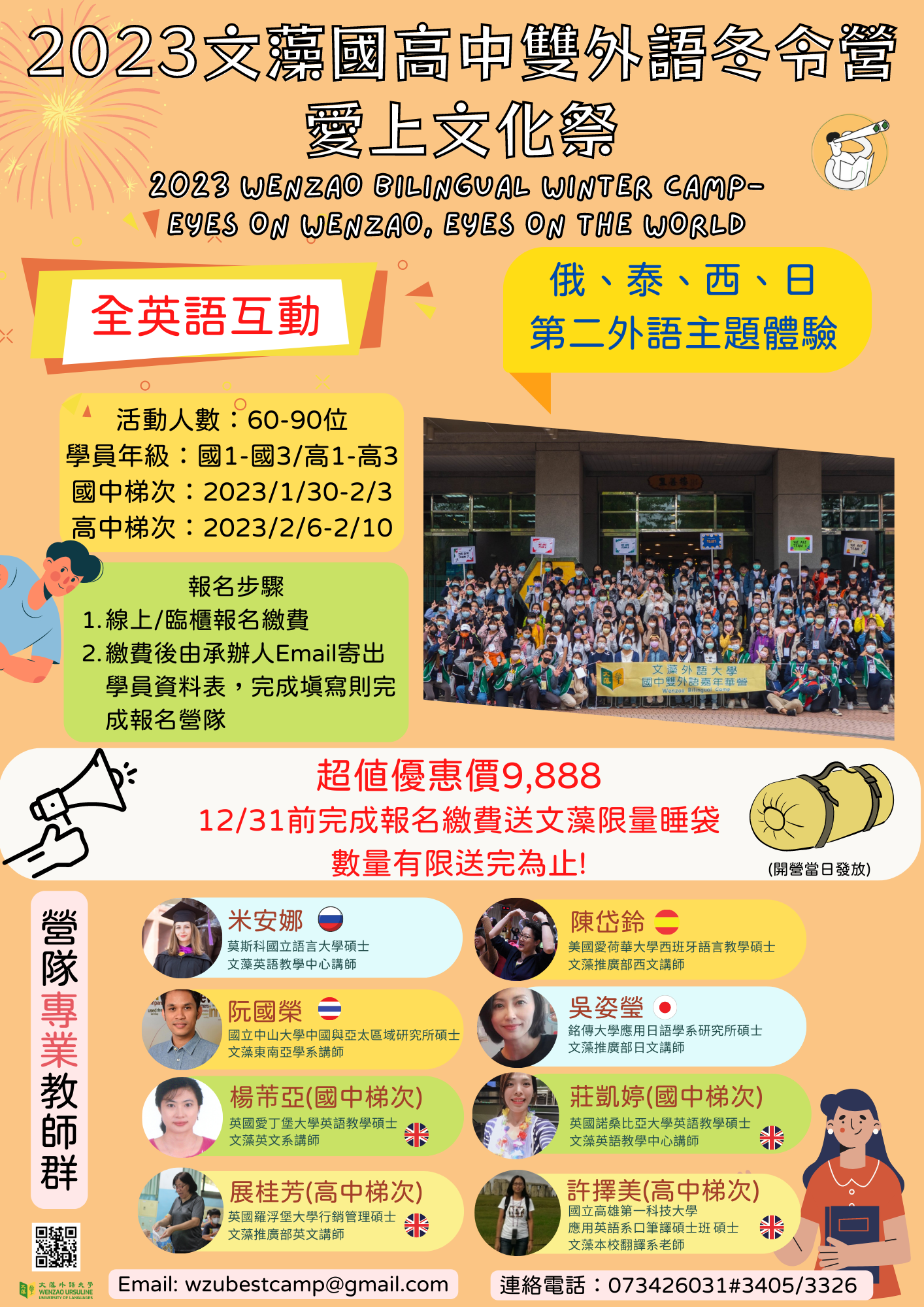 三、活動對象:國中學生(採全英語教學與活動進行,報名時請 檢附111學年度成績單英文70分以上或全民英檢初級初試通 過證明)。