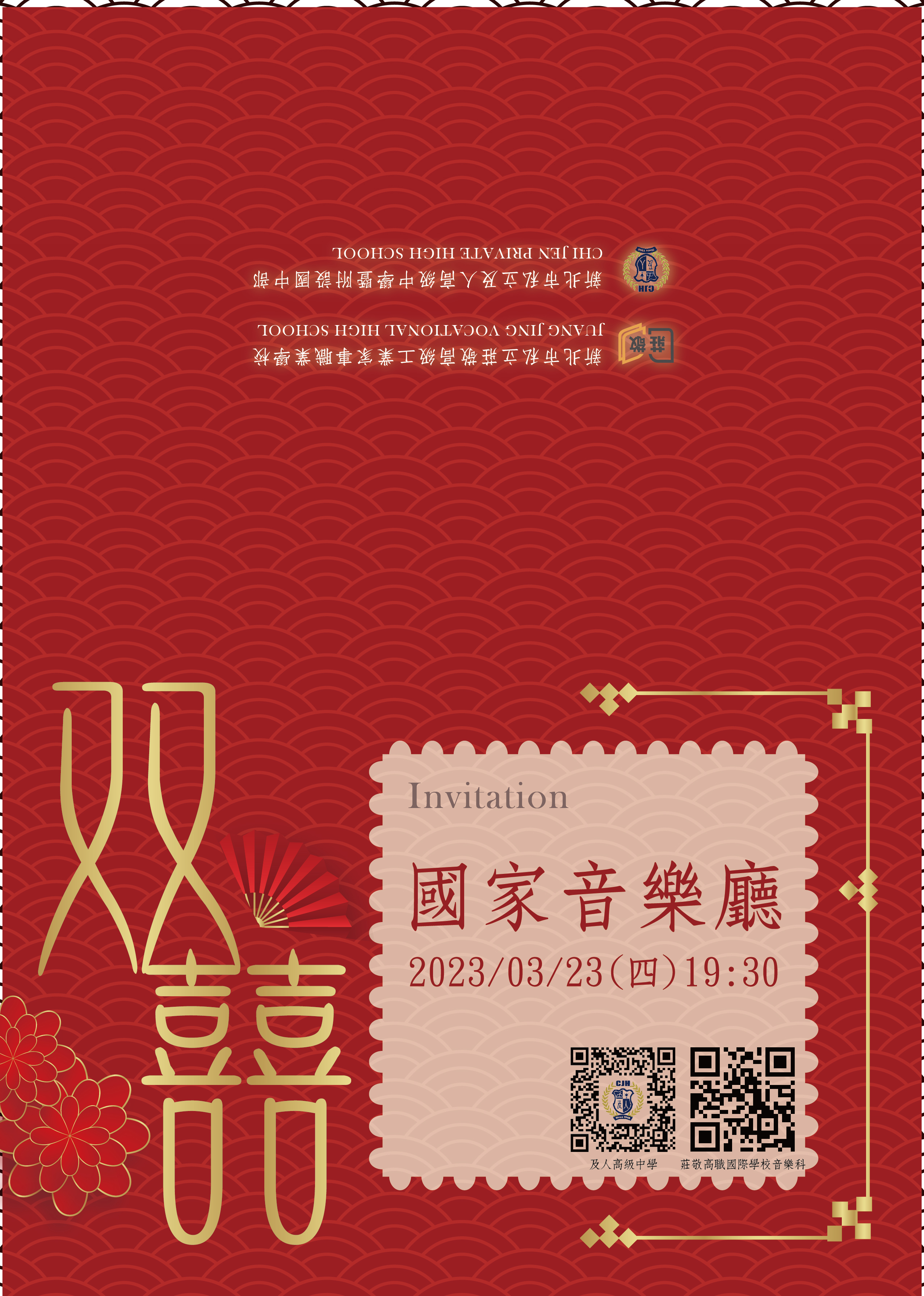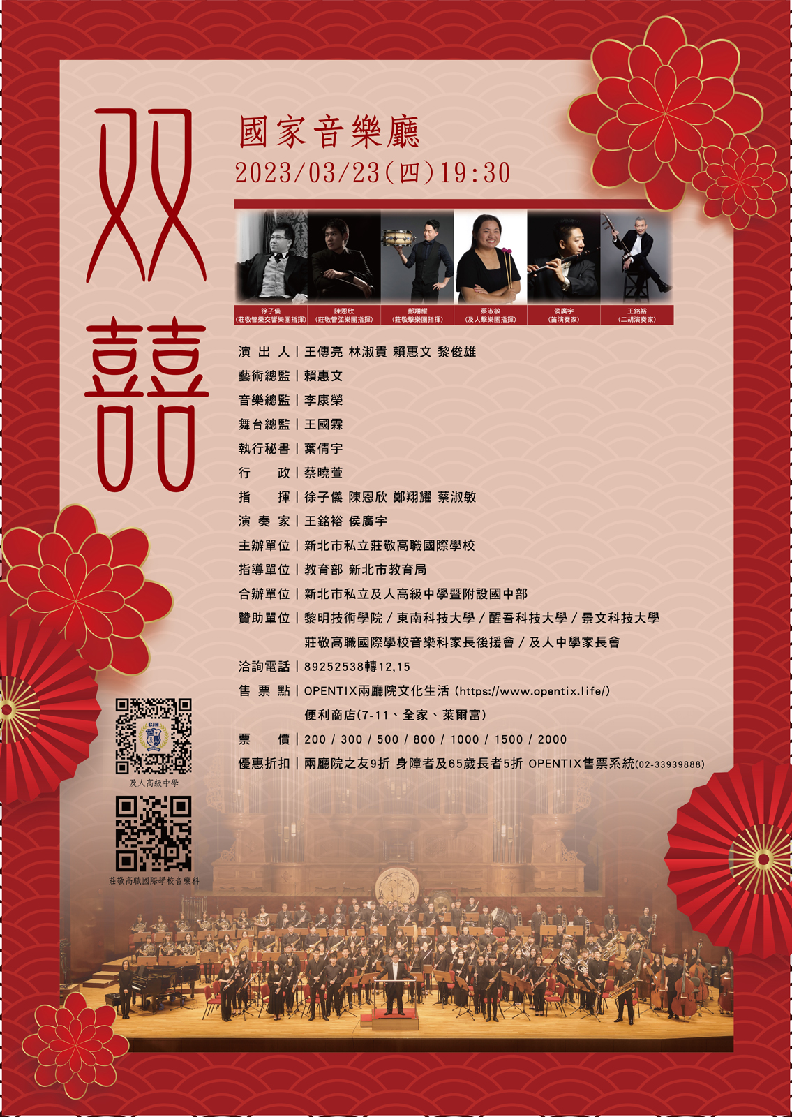 一、新北市私立及人高級中學擊樂團,訂於112年3月23日(星期四)於國家音樂廳舉辦「双囍」音樂會,檢送活動海報及邀請函電子檔,敬請惠予公告。