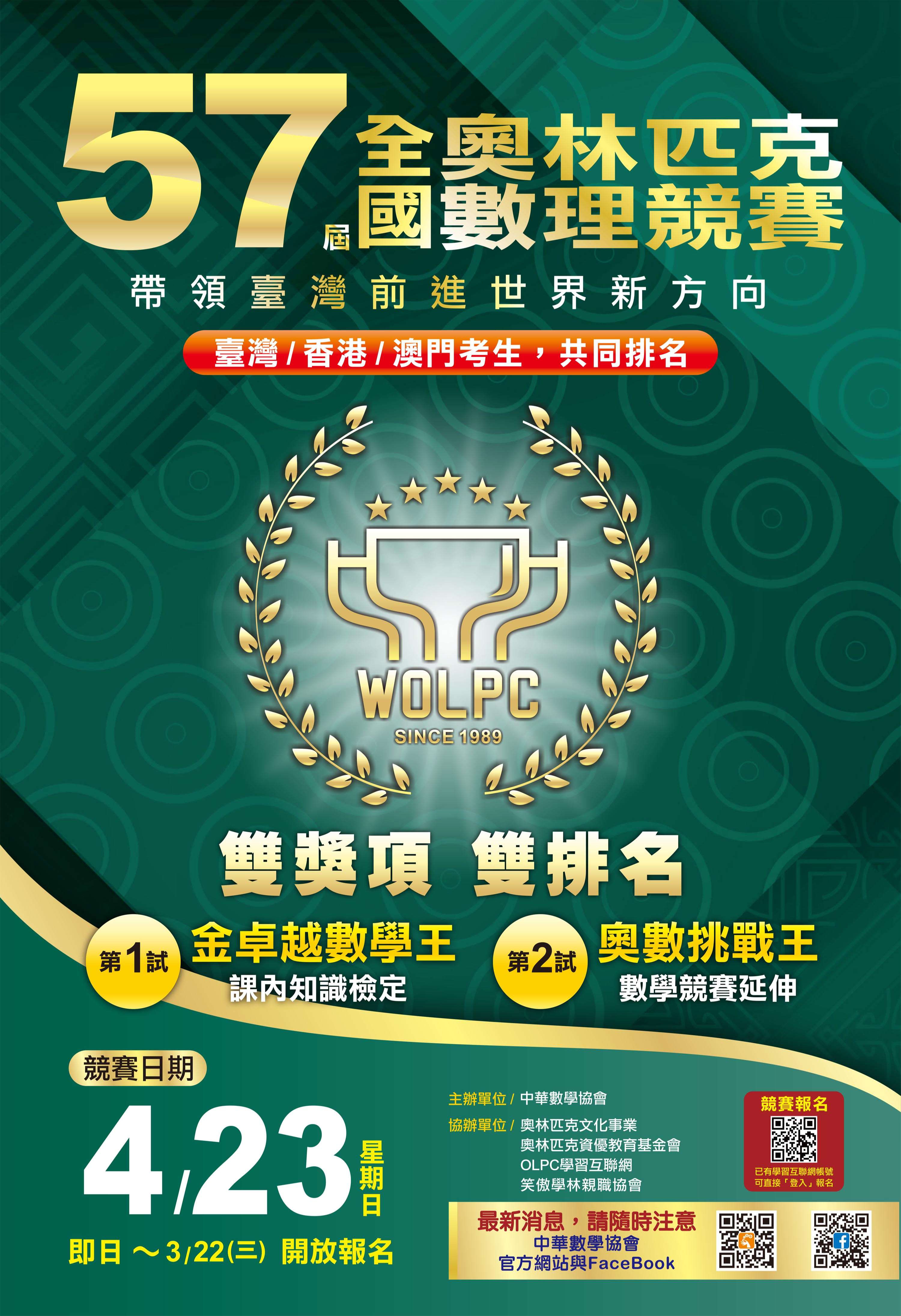 中華數學協會為推廣幼兒、國小及國中之數理教育,謹訂於112年4 月23日(星期日)舉辦 「第57屆全國奧林匹克數理競 賽」,旨在培養學童對數理的興趣,為國家培育優秀人 才。
