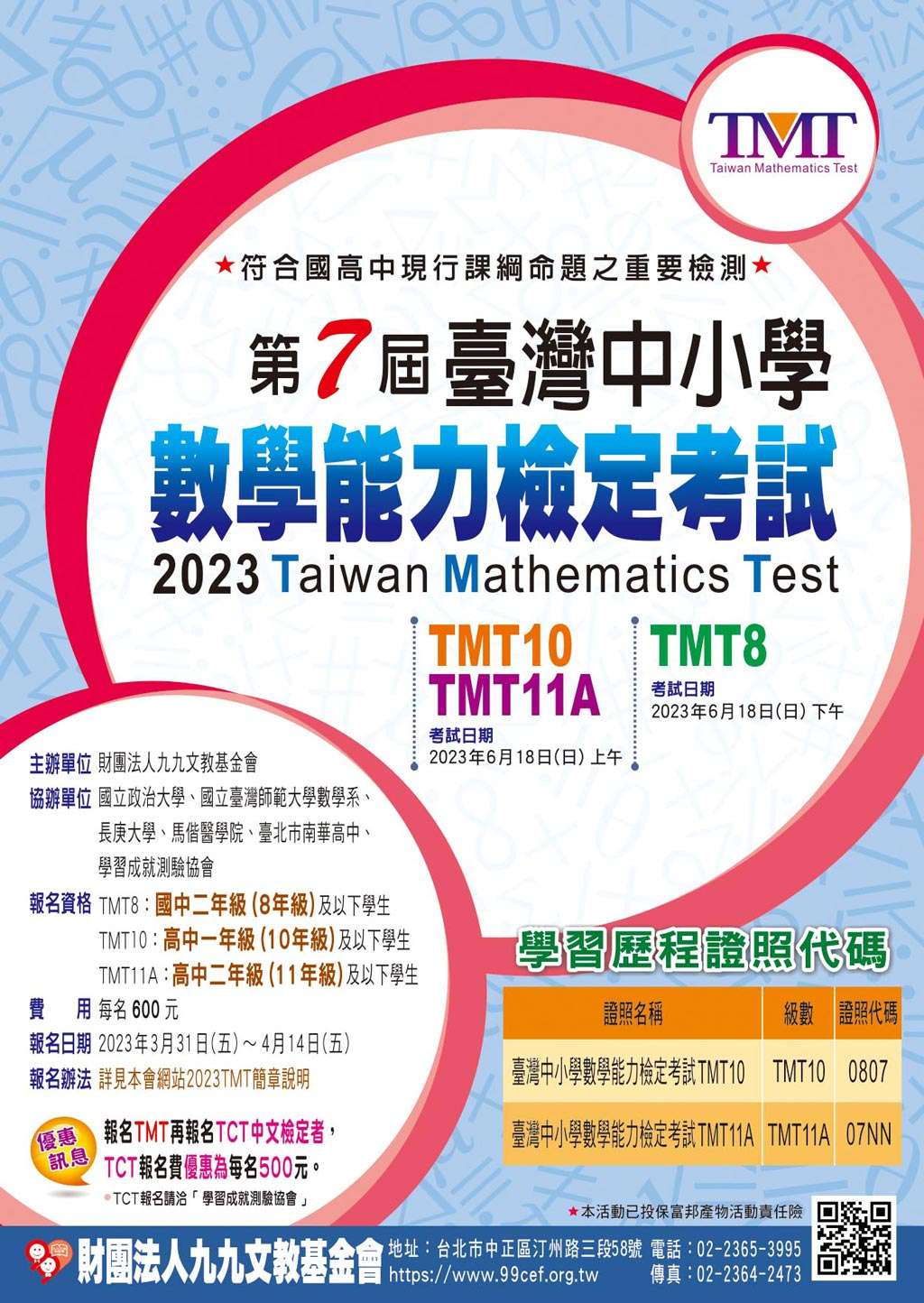 二、報名資格: 1. TMT8:全國8年級(國中二年級)以下(含)在學學生 2. TMT10:全國10年級 (高中一年級)以下(含)在學學生 3. TMT11A:全國11年級 (高中二年級)以下(含)在學學生