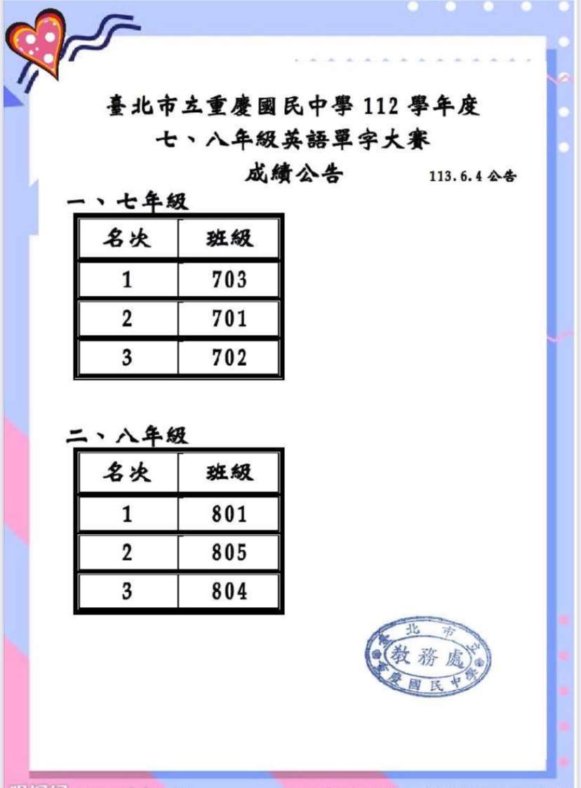 112學年度第2學期七、八年級英語單字大賽-成績公告,詳附件。