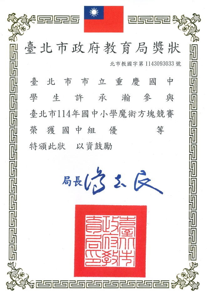恭喜 本校許承瀚同學 參加臺北市114學年度國民中小學魔術方塊競賽 榮獲優等!