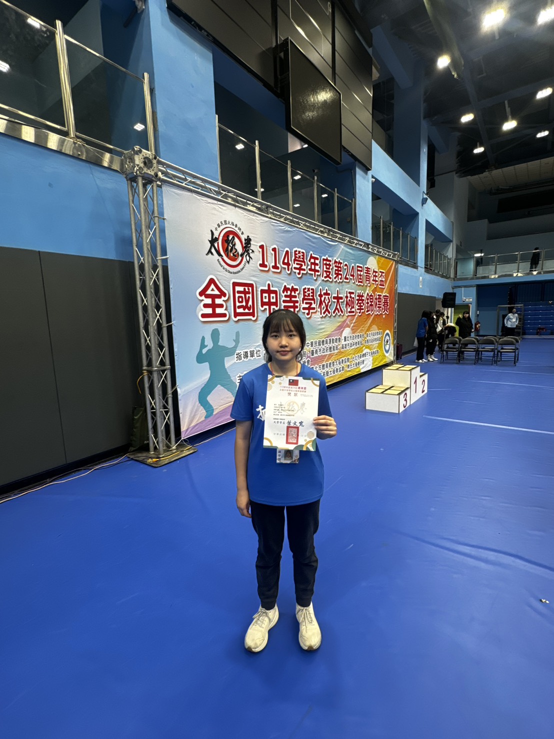 恭喜本校 803蕭品妤 榮獲114學年度第24屆青年盃全國中等學校太極拳錦標賽 推手組 國中女子組第五級(活步) 第四名!